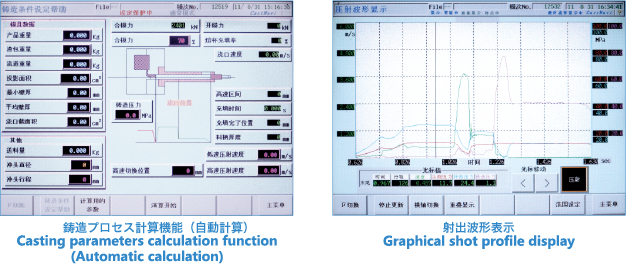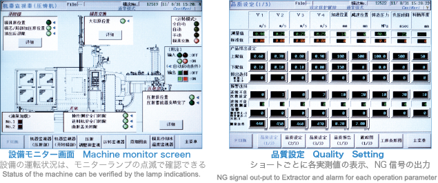 鋳造全過(guò)程を把握でき、鋳造條件などの各種設(shè)定値が、タッチパネルに表示され、設(shè)備の動(dòng)きを一目瞭然、尚且つ、100型の製品プロセスの保存もでき、操作に便利。