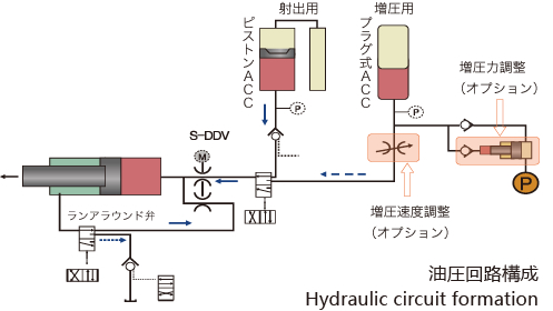 ?負荷に見合った圧力となるメータインと、速度安定に効果のあるメータアウトのそれぞれの利點を生かした「メータイン?メータアウト回路」による射出速度安定化。